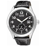 You Save : 40% Citizen Men's AT0810-12E Eco-Drive Strap Sport Watch The Citizen Men's Eco-Drive Strap Sport Watch has been perfected to suit both the professional man and the outdoorsman. This solar-powered Eco-Drive watch never needs a battery and remains charged for months at a time, even in the dark. Distinguished by rich black tones and chronograph technology, this watch's circular dial features three black subdials with sweeping hands over a striking black background. Textured with a grooved pattern, this background catches the light along with its overlaid frame of luminescent silver-tone bar hour markers and easy-to-read stick second markers. A large date window is perched at the four o'clock for at-a-glance reference, while the outermost dial is constructed with a tachymeter rim for computing speed (based on travel time) and distance (based on speed). This impressive dial is held by a silver-tone stainless steel case and bezel. And if you like to time short events, you'll be glad to note that the bezel is etched with Arabic second indexes in intervals of fifteen, as well as notched second markers along the first quarter-hour. A fine black leather band fastens this watch, featuring a crocodile pattern and a handy buckle clasp. Boasting a durable mineral window and the reliability of Japanese-quartz movement, this smart, distinctive timepiece is water resistant to 330 feet (100 M).